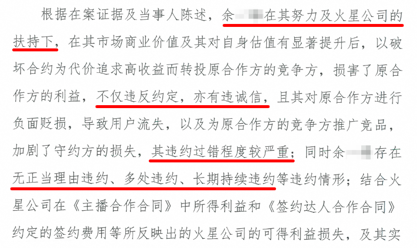二审法院在判决书中明确指出,余某某是在“其努力及火星公司的扶持下”,市场价值显著提升后,为追求高收益而“以破坏合约为代价”转投竞争方,余某某的行为“不仅违反约定,亦有违诚信”“违约过错程度较严重”。