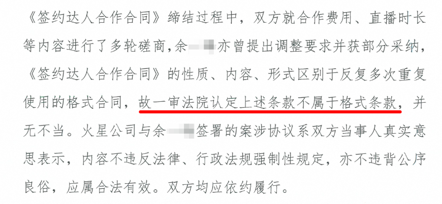 关于合同性质,法院指出,本案中,双方在合同缔结过程中就合作费用、直播时长等内容进行了多轮磋商,余某某曾提出调整要求并获部分采纳,合同性质、内容、形式均区别于重复使用的格式合同,故相关条款不属于格式条款。