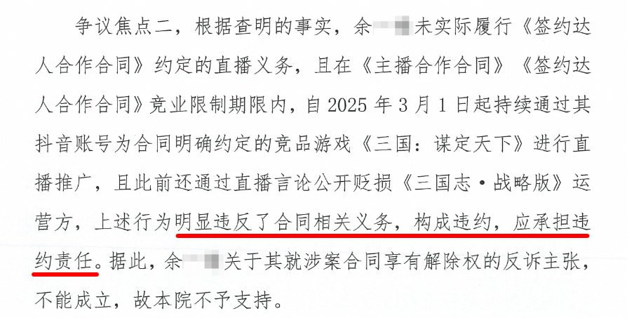 关于违约行为,二审判决书显示,余某某未实际履行合同约定的直播义务,且在《主播合作合同》《签约达人合作合同》竞业限制期限内,自2025年3月1日起持续为合同明确禁止的竞品游戏《三国:谋定天下》进行直播推广,此前还在直播中公开贬损《三国志·战略版》运营方,上述行为已构成违约。